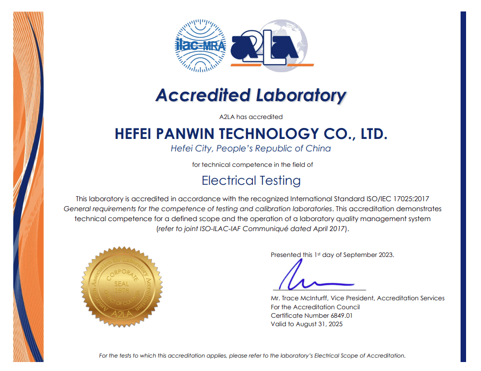 目前,磐稳同时拥有A2LA与CNAS认可资质,拥有先进的检测设备及专业团队,可为全球客户提供多元化、一站式检测认证服务。